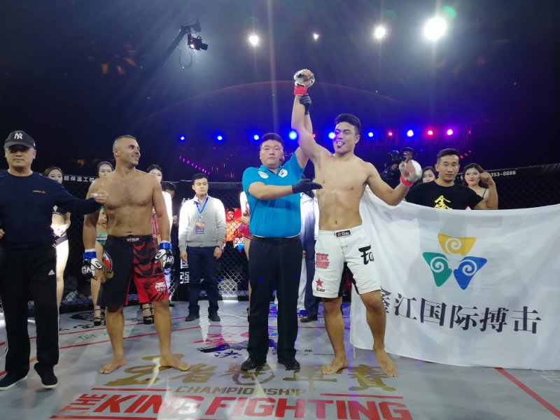 鑫江戰(zhàn)將—崔國輝率先上場參加61KG級比賽,對手是肖仁俊,兩人都非常年輕,卻都戰(zhàn)績滿滿,比賽經(jīng)驗豐富,首回合開始,二人便開始進行簡單的試探,對于進攻都非常的謹(jǐn)慎小心,不過崔國輝在比賽中更占據(jù)一些主動性,一直在壓迫著對手,使得對手一直在緊貼著籠邊活動,崔國輝在幾次換拳中,多次準(zhǔn)確命中對手,但力量上稍有薄弱因此也未能直接造成終結(jié),第二回合開始慢慢適應(yīng)了對手的攻擊后,打出了幾次漂亮的反擊,最終三回合之后,大比分優(yōu)勢獲得勝利。