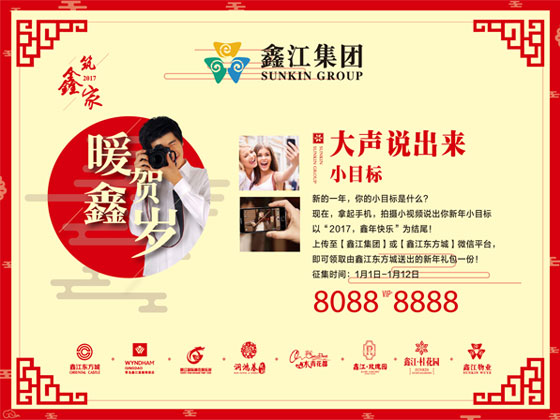 1月1日-1月12日,拍攝小視頻,說(shuō)出你的新年小目標(biāo),以“2017,鑫年快樂(lè)“為結(jié)尾,上傳至【鑫江集團(tuán)】或【鑫江東方城】微信公眾號(hào),即可免費(fèi)領(lǐng)取新年禮包一份,同時(shí),1月21日-27日,【青島東方城】微信公眾號(hào),將開(kāi)啟在線有獎(jiǎng)轉(zhuǎn)發(fā),轉(zhuǎn)發(fā)視頻圖文至朋友圈,即可免費(fèi)領(lǐng)取新年好禮一份。