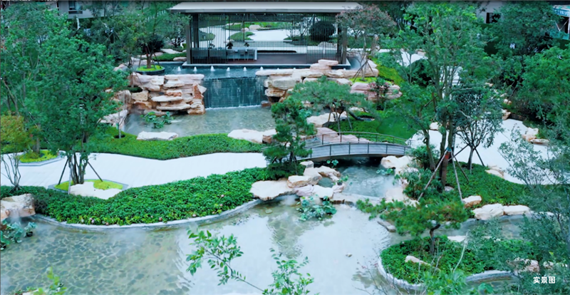 鑫江·瑞府,充分考慮山景、宅邸、人居理念,整體以縱向?yàn)檩S、橫向?yàn)槊}的布局方式,匠筑“三苑六巷七園”三重圍合園境,取法王維《輞川圖》精髓打造瑞府二十景,華子岡、歆湖、攬勝軒、臥虹橋......每一處景觀皆有特色,與疊瀑、遠(yuǎn)山相襯,與建筑自然相融,別有一番趣味。同時(shí)將烏桕、紫薇、泰山松等多種名貴苗木全冠移植其中,并搭配四季主題植物,使得綠地率高達(dá)約40%,開(kāi)窗即是滿目蔥綠。